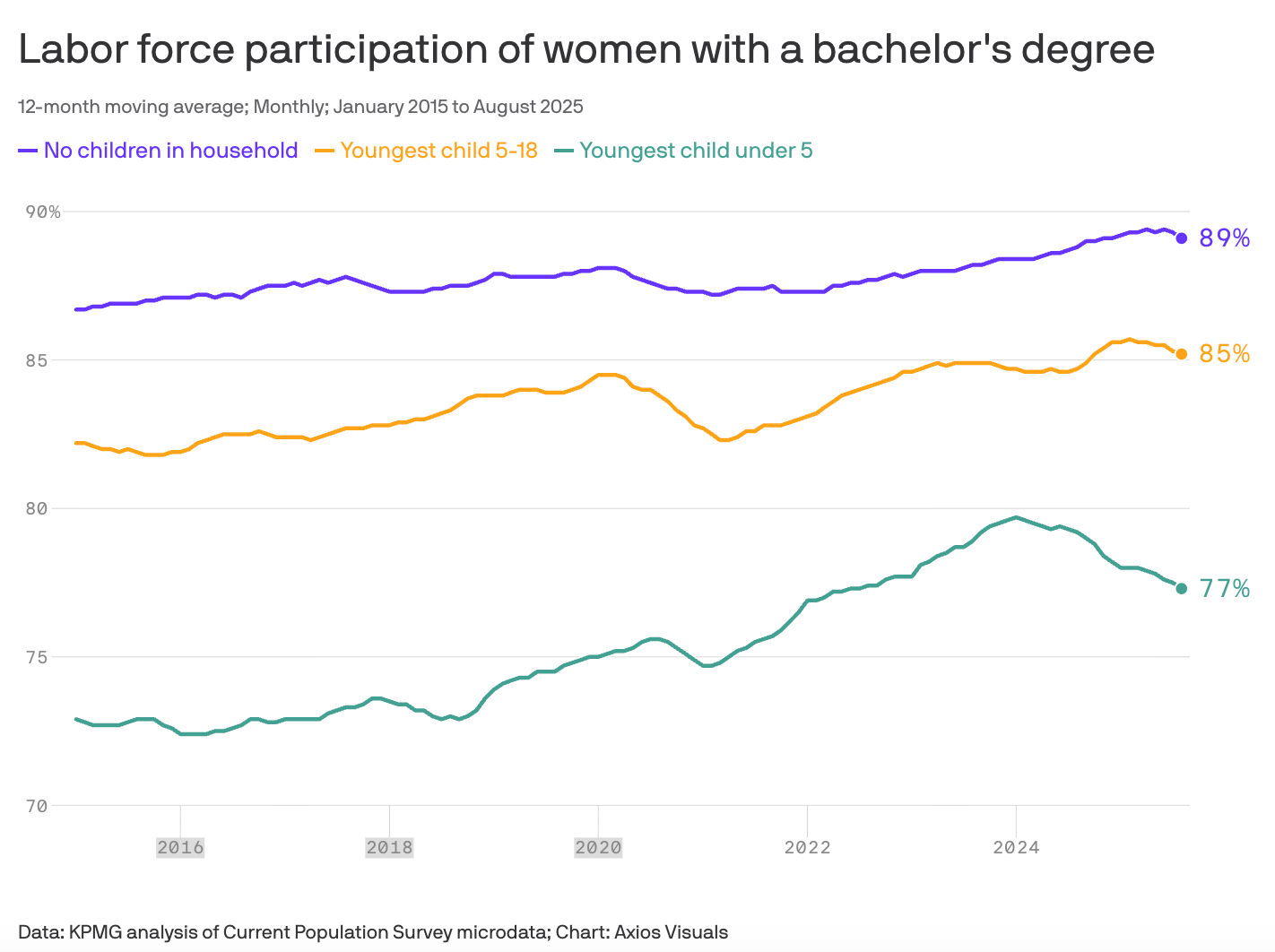 After women’s employment hit an all-time high in the post-Covid era, mothers are now leaving the workforce in startling numbers. There is a yawning gap between college-educated women who don’t have children living with them, and those who have kids who are not yet school age, as this chart from Axios shows: