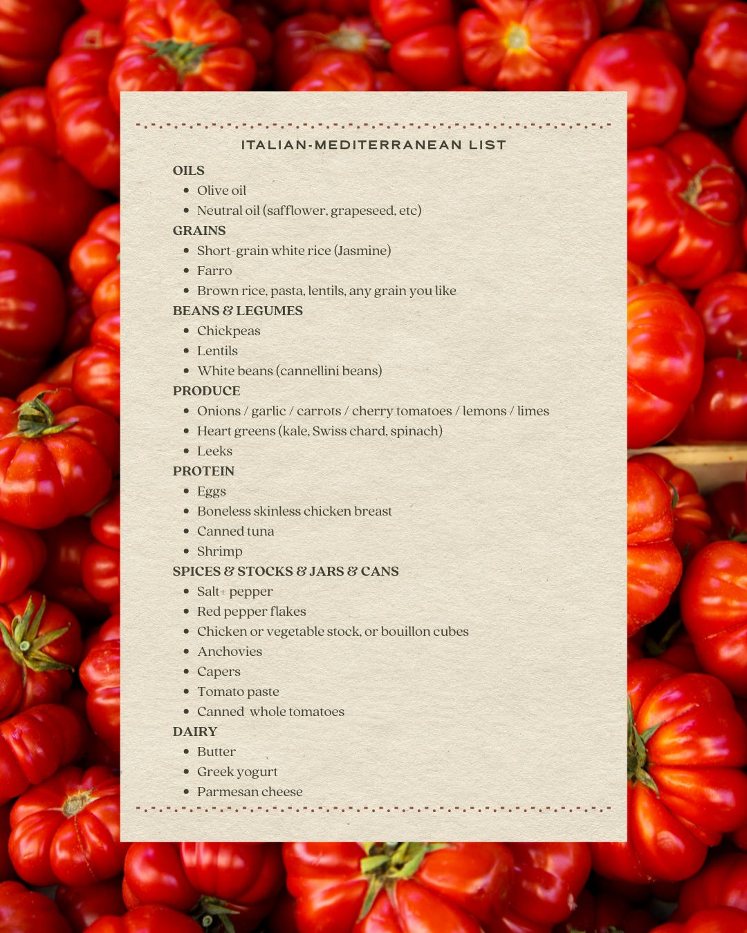 A pantry guide for the person who likes Italian / Mediterranean food.