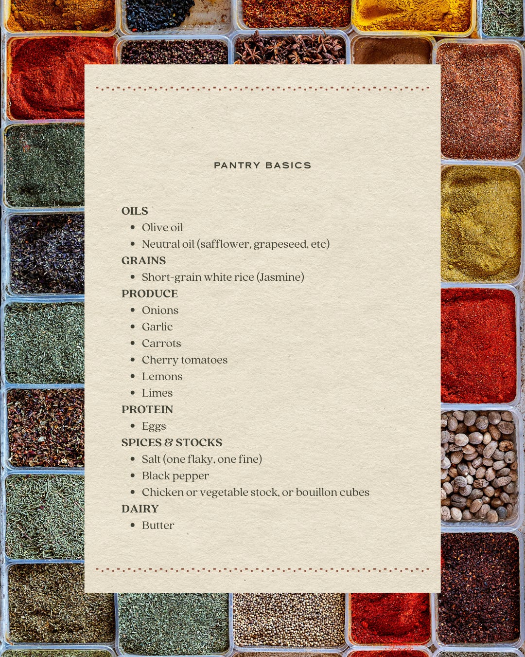 A pantry guide for the person who just wants to cook simple proteins + vegetables.