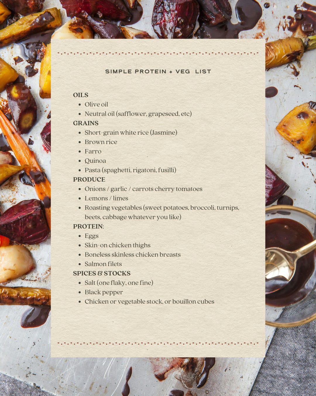 Root vegetables: The basics + red onions, shallots, and whatever easy roasting vegetables you like to eat: Sweet potatoes, regular potatoes, squash, bell peppers, zucchini, Brussels sprouts, cabbage, broccoli, cauliflower, parsnips, beets, turnips. Definitely don’t buy all of these at once! See what the recipe calls for, or see what looks good at the market, pick two or three, and eat them all week.