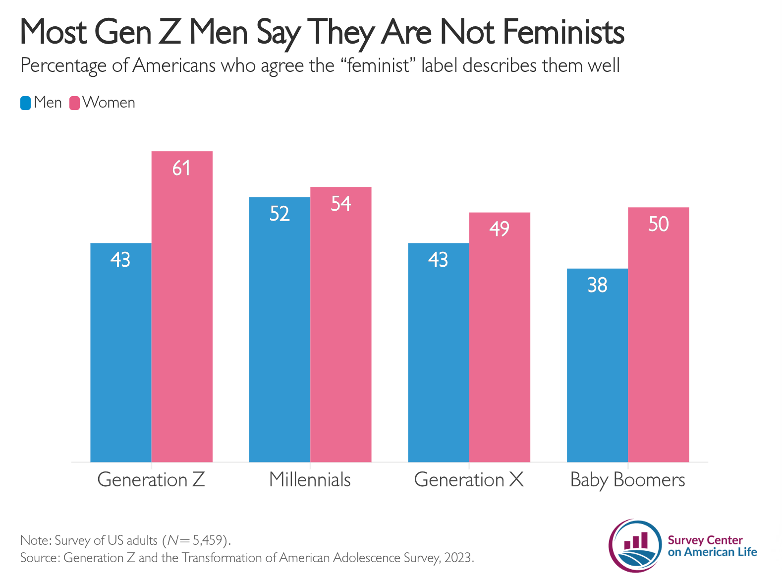 For many Millennial women, “the right person” is a feminist-minded man, even if he doesn’t use the word “feminist.” And Millennial women have more access to feminist-minded men than any generation before or after us. The proportion of Millennial men and women who self-identify as feminists is close to equal: 54% of women and 52% of men. Roughly half of Gen X and Boomer women are feminists, while the men of those generations are largely not. Gen Z women, though, are the most feminist of all, at 61%. But Gen Z men are more in line with the men of Gen X: Just 43% of them say they’re feminists, a nearly 20-point gender gap, the largest of any generation: