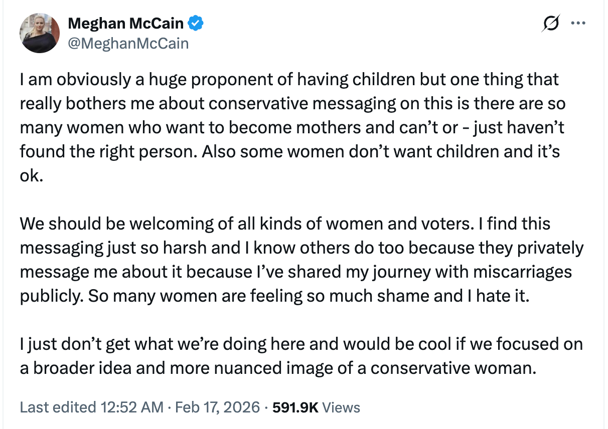 Since Trump’s re-ascendance to the White House, the reactionary conservative movement has become the most aggressive and unfettered it has been in my lifetime. And they are getting very, very clear on what they think an acceptable life looks like for women: Settle for any man who decides he wants you; don’t go to college; marry early; have as many babies as possible; quit your job (or don’t pursue one in the first place) to stay home full time and depend financially on your husband; shoulder the blame if you wind up married to a jerk; wind up impoverished if you divorce; and face social condemnation if you fail to follow the Trad Wife script. Contraception should be illegal or at least hard to get; same for IVF and other fertility treatments. The reactionary conservatives of the New Right are not simply pro-natalists who want lots of babies; they are people who want to impose a strictly patriarchal model of the family on all of us, which has certain kinds of women having babies, and other women punished for deviating. And that requires giving men greater rights and freedoms, while allowing women fewer.