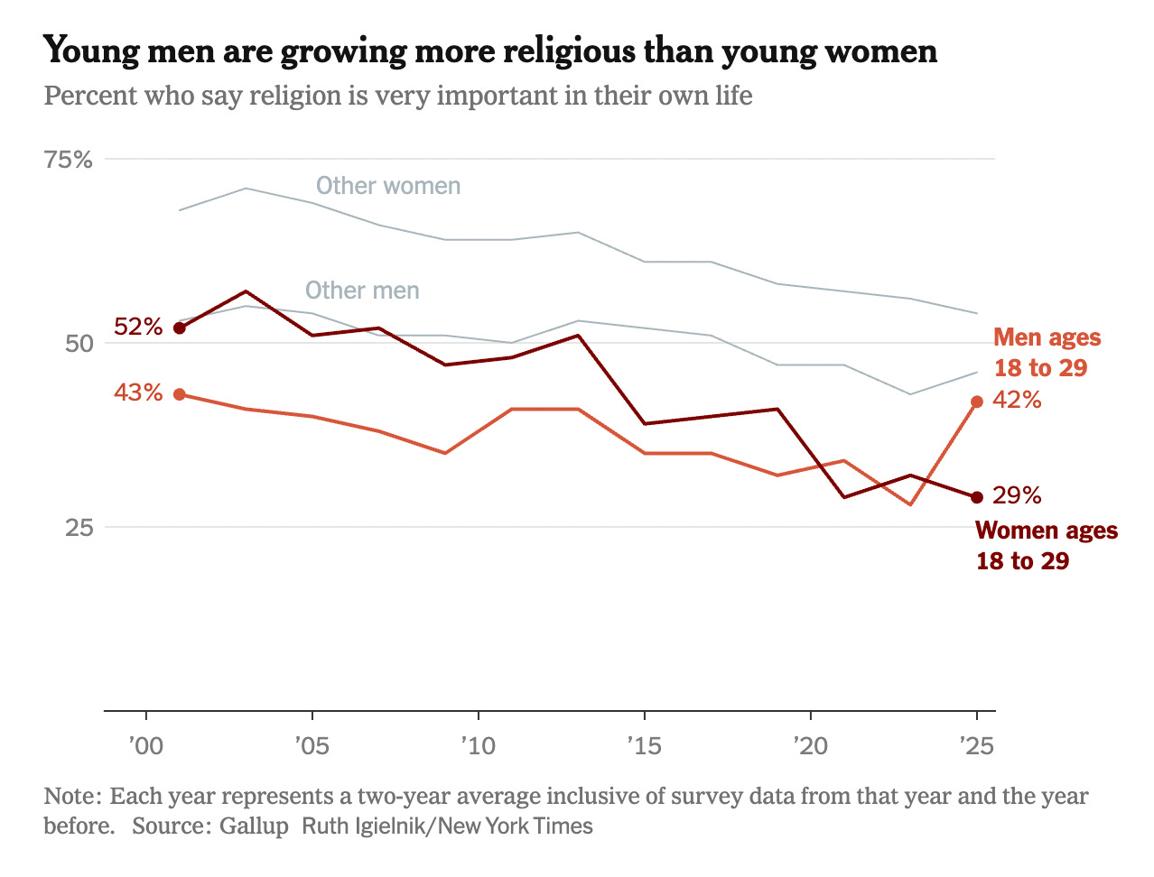 I’m not convinced that this shows some widespread return to religion. But I do think it is further evidence of a significant divide in worldview between young men and young women — and perhaps indicative of conservative young men looking for institutions that will help them make meaning of their lives, and affirm their desire for respect, adulthood, and authority.